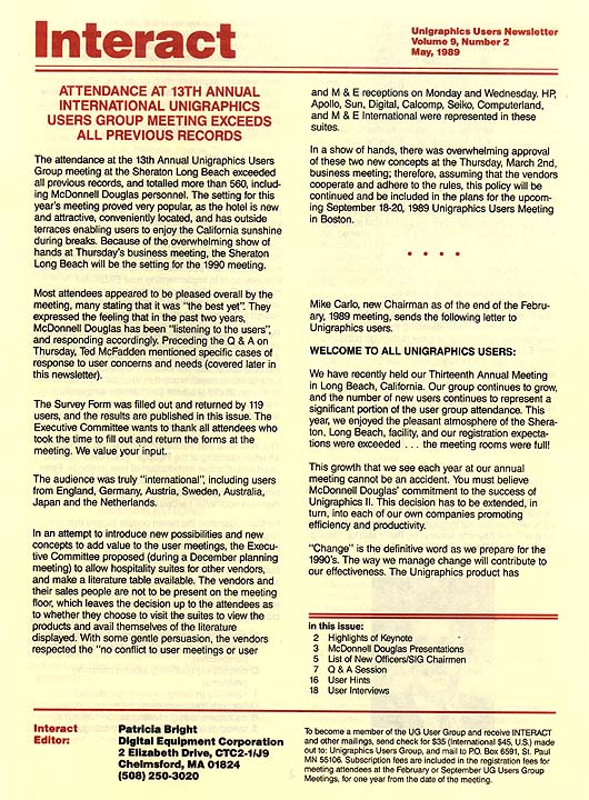 This issue provided a review of the activities from the 13th Annual Unigraphics Users Meeting held in Long Beach, CA. The issue included several user interviews from the spring meeting as well as an update of the current regional user groups. Also included in this issue was a review of the ER's submitted by the various SIG's.