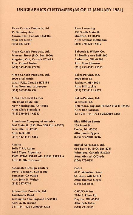 The remainder of this document contains the complete list of all Unigraphics customers (by installation sites) as of January, 1981. The list consists of a total of 56 customers covering 71 sites (note that one or more systems may be installed at a single site).