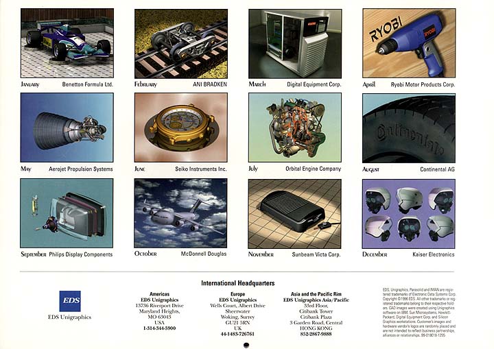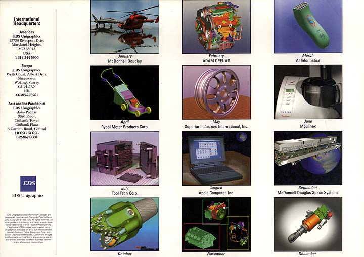 The Unigraphics Calendar has been a great opportunity for Unigraphics customers to showcase their products as well as a forum for exhibiting the capabilities of UG/Photo and the artistic skills of individual users. Below are images of the front and back cover of each years calendar.