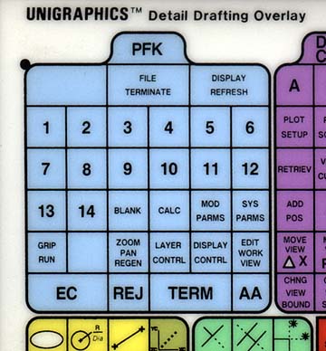 There was even an optional overlay that could be used with certain data tablets (such as the IBM one above) that allowed a user to select options from a schematic of the standard PFK layout using a puck. While this was not a particularly popular option, it was used at several Unigraphics customer sites.