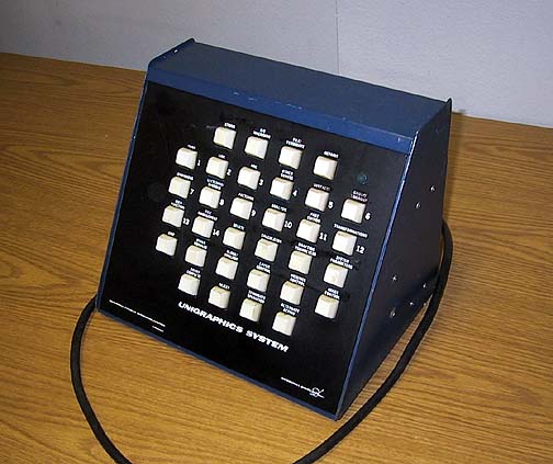 Unigraphics metal encased PFK (circa 1982)This photo shows the first of the new lower profile, metal encased PFK that was introduced with the ADS/DDS workstations as well as the D90. This PFK did not use an overlay, rather the labels on the buttons were small plastic squares inserted into the clear plastic keys. Of course this meant that when users had to upgrade to UGII, they had to remove the inserts on those keys whose labels were changed and replace them with new ones. It was eventually replaced with a similar configuration except that the metal case was replaced with a more modern looking plastic housing. Also with this early version of this style PFK, the section holding the joy-stick could be replaced with an optional set of thumb wheels for those people that preferred them based on their previous use of the Tektronix 4014 terminals.