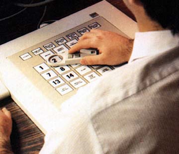 The photo's below will follow the history of the PFK as it evolved over the years. As stated before, the PFK was the main feature of the User Interface of Unigraphics until the release of V10.0 (note that once the first Unix window based system was implemented, the PFK, while still supported, was optional as there was also support for selecting menu options using standard keyboard function keys and the numerical keypad was mapped to provide the equivalent of the 14 numbered keys).